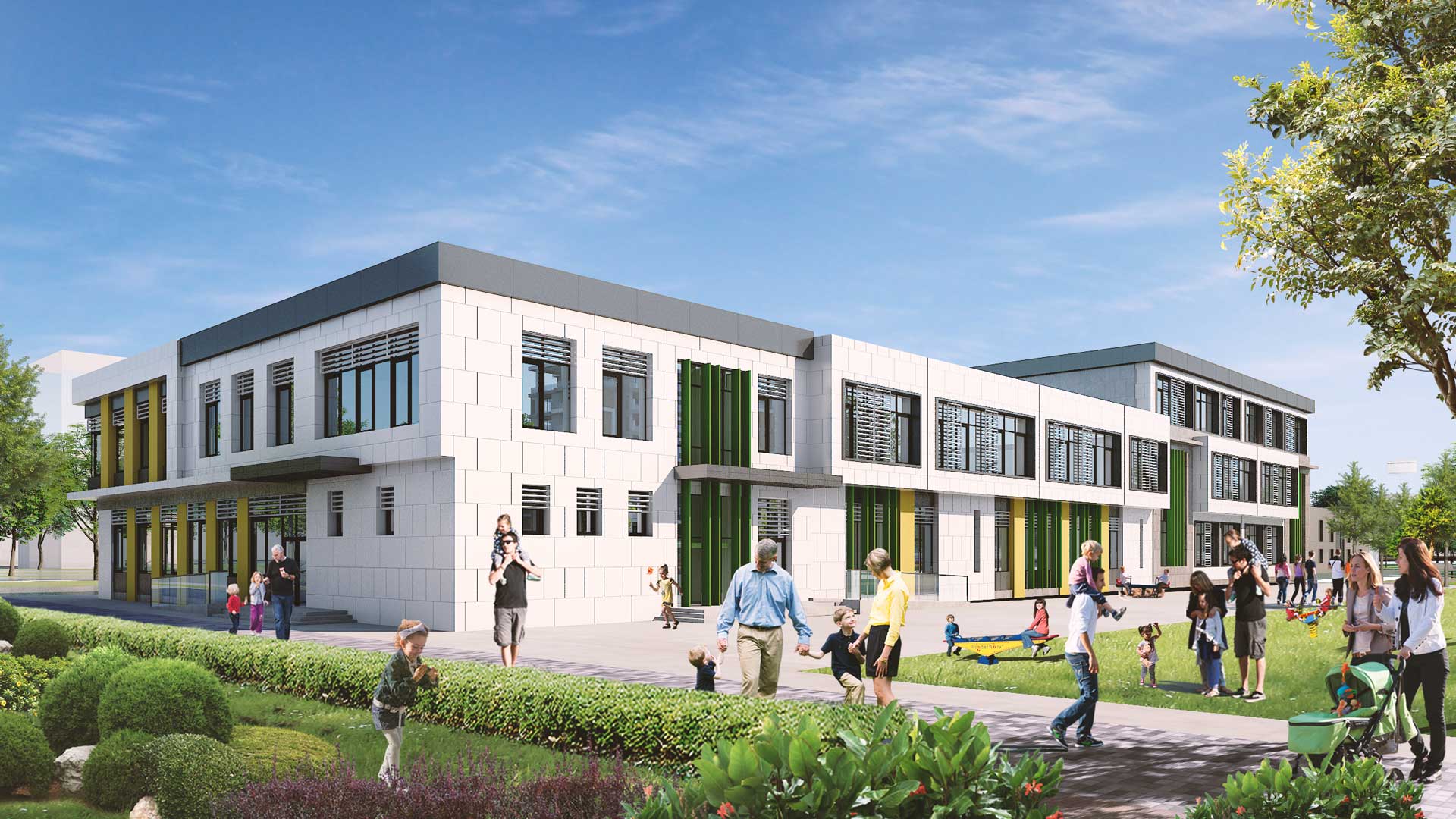 На территории Лота №1 появятся инновационный детский сад, рассчитанный на 385 детей; спортивно-оздоровительный комплекс с бассейнами, хамамом и фитнес-кафе; подземный паркинг на 1482 автомобиля; супермаркеты. Первые этажи некоторых блоков используются в качестве торговых площадей, где будут размещены продовольственные магазины, кофейни, бутики и многое другое.